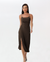 فستان ميدي ضيق بثنيات من الخصر وفتحة للفخذ وحمالات من النصف بمعدن مزينة