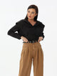 بنطال الجينز الواسع بحزام وثنيات يمثل قطعة مميزة وعصرية. القصة الواسعة تمنحك حرية الحركة وراحة طوال اليوم، بينما الحزام يضيف لمسة من التفصيل الأنيق. الثنيات تضيف عنصرًا جماليًا وأنثويًا إلى التصميم.