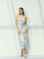 تصميم الفستان يتضمن ربطات من الخلف، مما يضيف لمسة عصرية وابتكارية. هذه الربطات تسمح بتعديل المقاس وتمنح الفستان شكلًا رائعًا يبرز الخصر بشكل أنيق. كما تضيف هذه التفاصيل لمسة من الإثارة والأنوثة إلى الإطلالة.