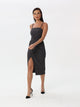 A fitted midi dress with a ruffled waist and thigh slit is an elegant and attractive piece. This dress features a design that fits the figure and highlights the waist thanks to the distinctive ruffles. It also features a thigh opening that adds a touch of excitement and femininity.