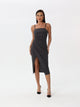 Midi dress with ruffles at the waist, a thigh slit, and half straps with metal decoration