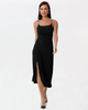 Midi dress with ruffles at the waist, a thigh slit, and half straps with metal decoration