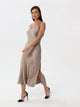 Shine in a luxurious and modern veined silk midi dress. This dress features soft and shiny silk fabric, adding a touch of elegance and luxury. The veined design gives the dress beautiful and distinctive details, enhancing the beauty of the piece. The dress has a loose fit, V-neck, and long sleeves, made from 100% silk to provide a sophisticated and unique look.