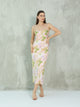 The dress features colorful floral patterns beautifully scattered on the white fabric, creating an attractive contrast that reflects the spirit of nature and vitality. The bright colors of the flowers add a touch of joy and liveliness.