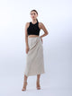 This silk skirt with side pleats and a thigh slit is an elegant and attractive piece. The side pleats design enhances the elegance and attractiveness of the skirt, and gives it beautiful movement when moving. The thigh opening adds a bold and feminine touch, making it suitable for special occasions and evening occasions.