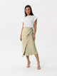 This silk skirt with side pleats and a thigh slit is an elegant and attractive piece. The side pleats design enhances the elegance and attractiveness of the skirt, and gives it beautiful movement when moving. The thigh opening adds a bold and feminine touch, making it suitable for special occasions and evening occasions.